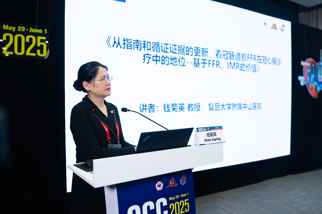 在主旨演讲环节,钱菊英教授进行了主题为《从指南和循证证据的更新,看冠脉造影FFR 在冠心病诊疗中的地位--基于 FFR、IMR 的价值》的主旨演讲。她指出:“冠状动脉血流受心外膜冠脉和心肌内微循环影响,过去单纯评估心外膜冠状动脉狭窄程度存在局限。随着2024 ESC指南对于慢性冠状动脉综合征(CCS)定义的变更,我们需要重新审视冠心病发病机制,积极推动冠心病传统诊疗模式的转变:从单纯‘心外膜’冠脉功能学评估,到‘心外膜+微循环’冠脉功能学全面评估,从缺血转向动脉粥样硬化性冠状动脉疾病。”